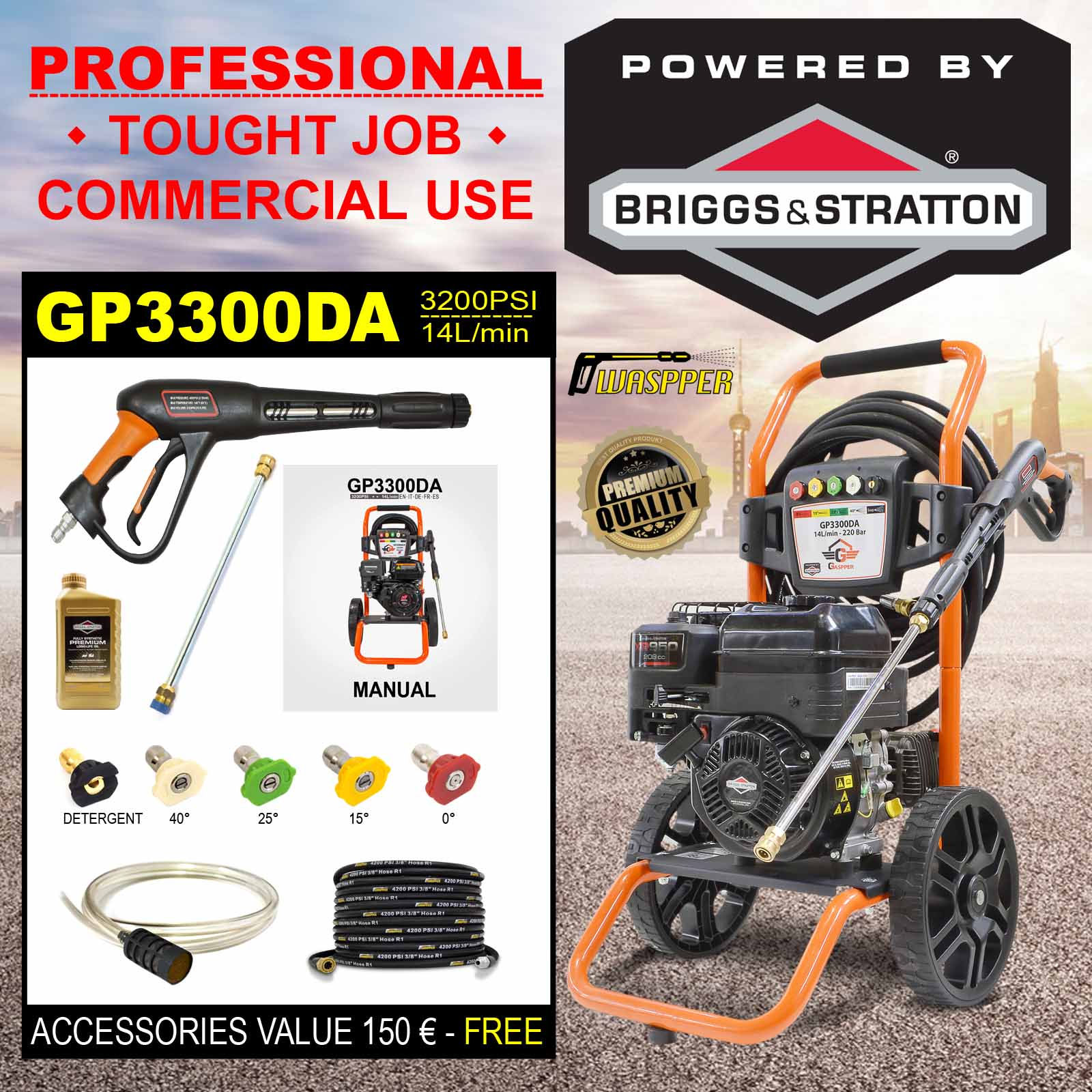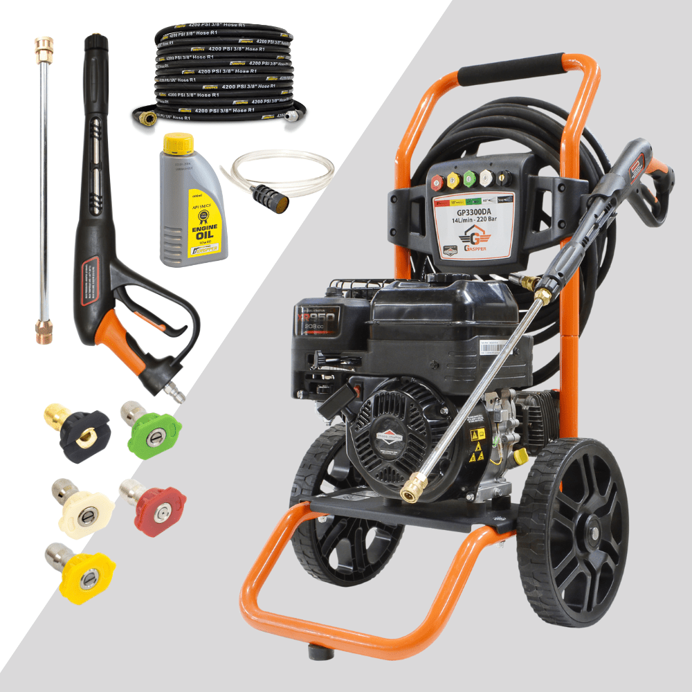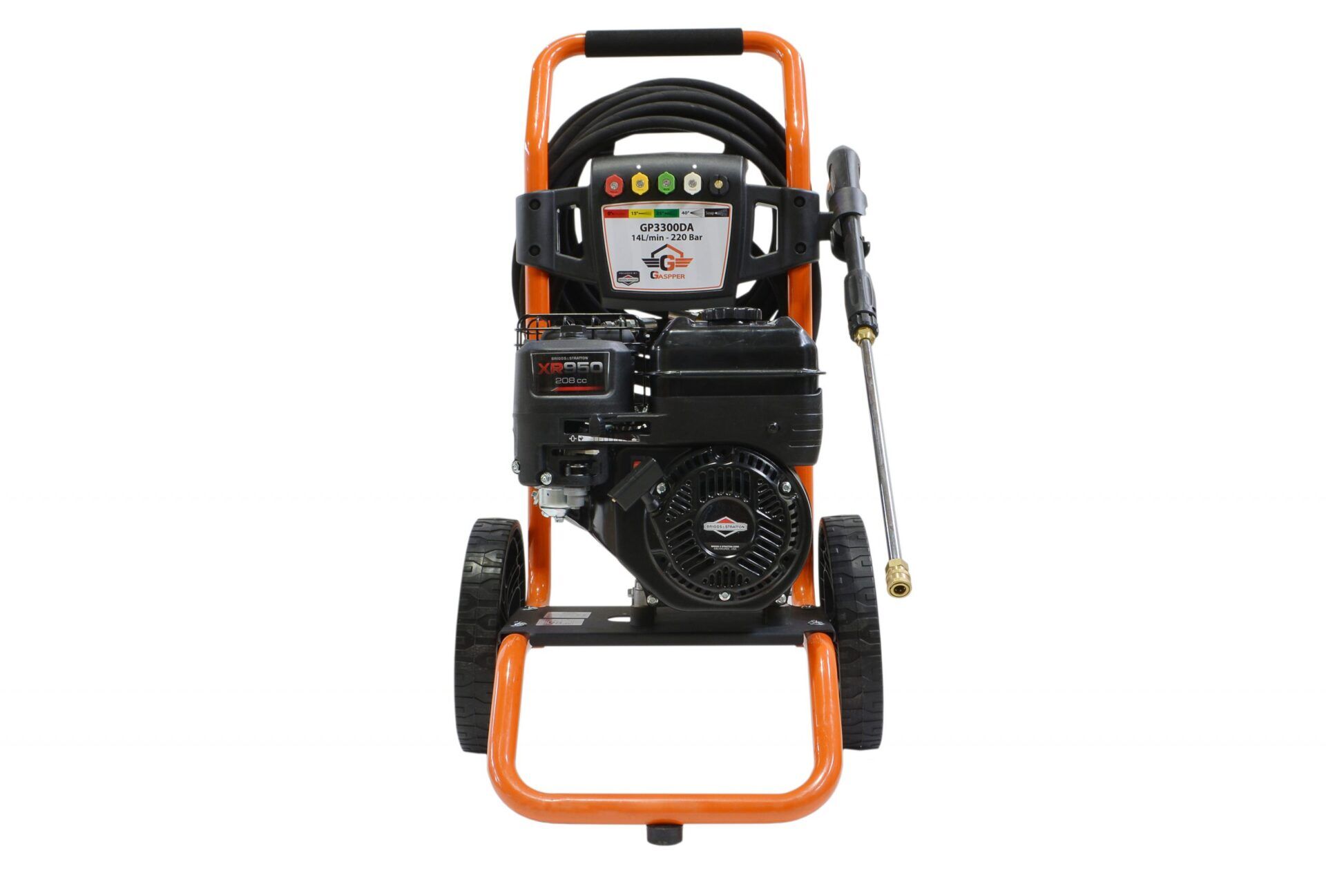 High-pressure washer Gaspper GP3300DA makes cleaning easy and enjoyable even in large surface areas. With a maximum pressure of 220 bar and a water flow of 14 l/min, this high-pressure washer can be used for the most demanding cleaning work. It‘s Premium Class, which is characterized by better parameters and longer service life than Hobby Class. A high-pressure washer is equipped with a gasoline OHV Briggs & Stratton engine with speed control, a low oil engine protection system, and a powerful pump with adjustable water pressure control, which guarantees higher user comfort. Simple maintenance of all-metal pump with brass head significantly prolongs the lifespan of high-pressure cleaner. By default, this device comes with a 10 m rubber hose, 0 °, 15 °, 25 °, 40 ° high-pressure nozzle, and nozzle for soap self-priming application. During production, we emphasize the ease of operation, high quality, and the long life of the products. This equipment will provide you with years of trouble-free operation regularly.