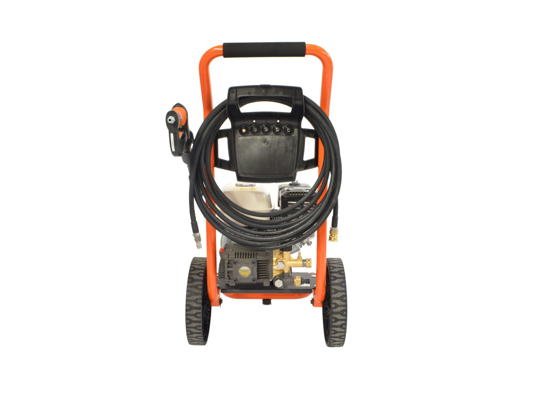 Rugged components provide longer life with continuously adjustable water pressure. The machine is delivered with an ergonomic pressure gun, a 10 m rubber hose, and 5 types of nozzles.