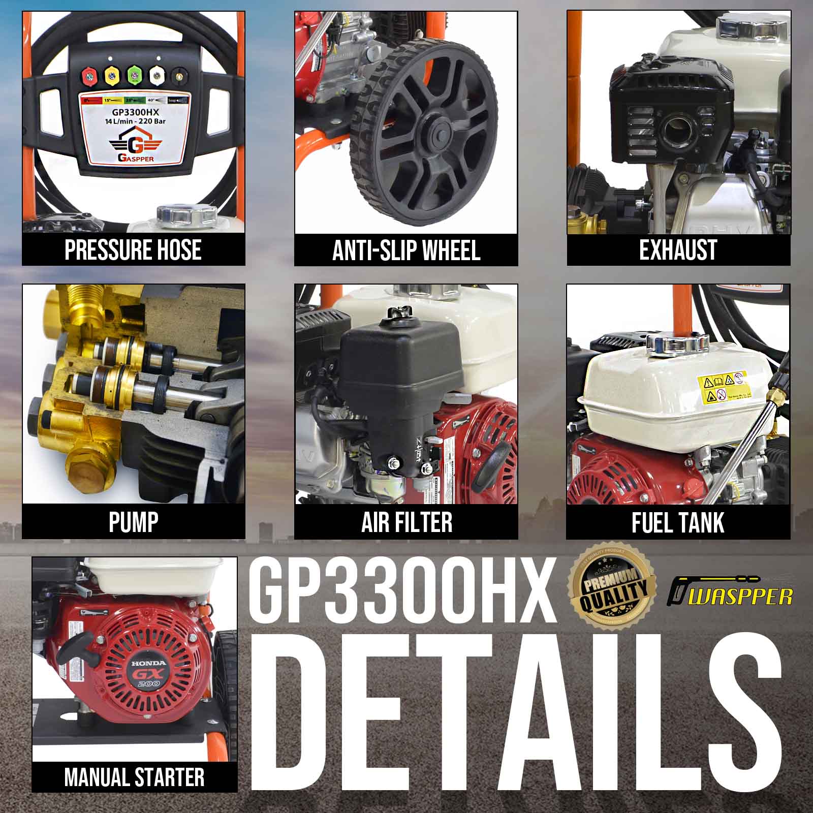With Gaspper GP3300HX pressure washer, the cleaning process is very simple and pleasant, even in the case of larger surfaces. With a maximum pressure of 220 bar and a flow rate of 14 l / min this pressure washer is suitable even for the most difficult cleaning jobs.