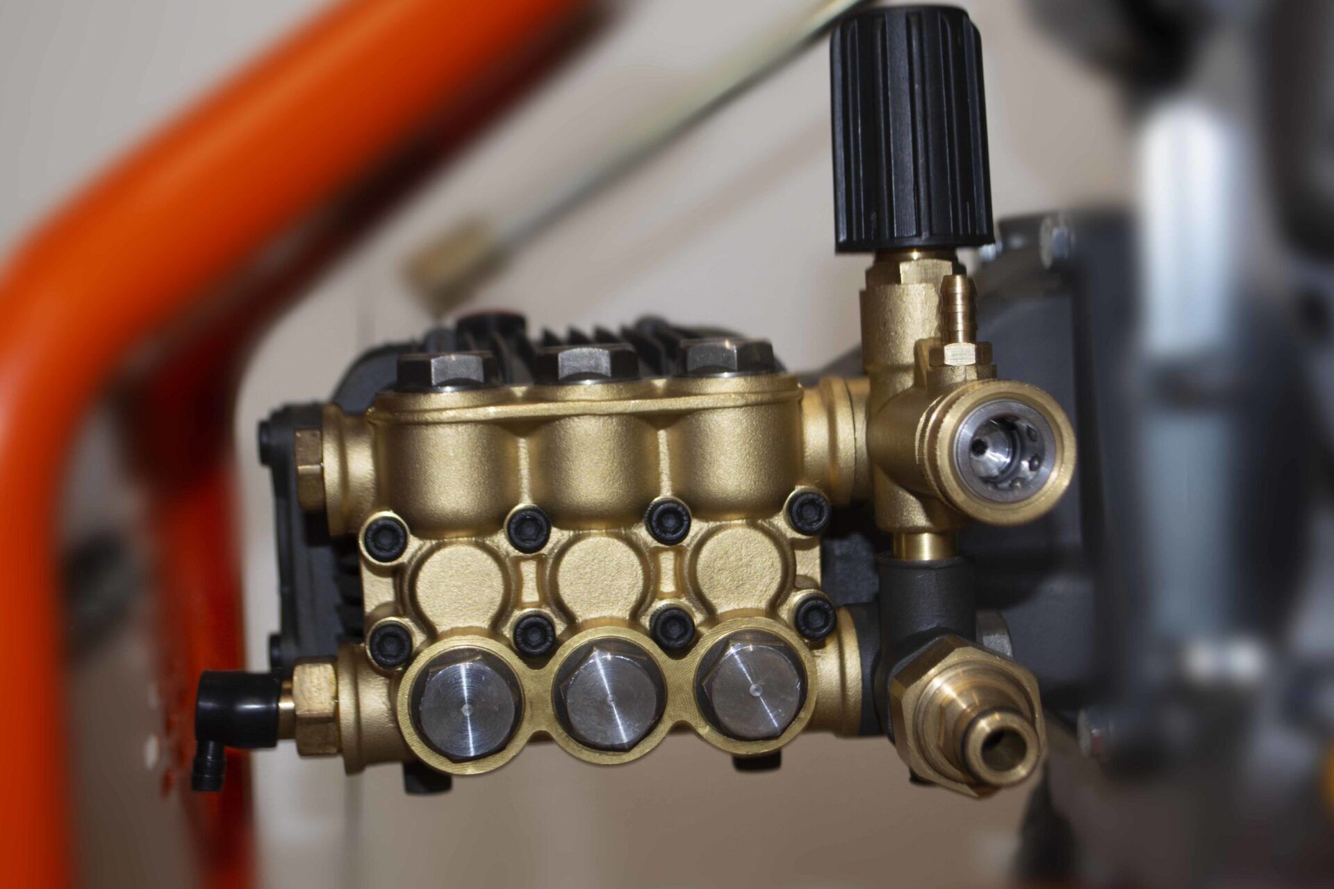 - Aluminum pump with brass head, ceramic pistons, and water pressure control