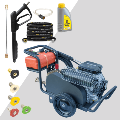 Cut Through Grime Like Never Before: Experience professional-level cleaning with the Waspper GP5000BC, a gas-powered pressure washer built for tackling the toughest jobs. Boasting a powerful 20.8 HP Briggs&Stratton Vanguard engine, a heavy-duty aluminum pump with a brass head, and a ceramic piston system, this machine delivers a bone-crushing 350 bar (5,000 PSI) of pressure and a flow rate of 22 liters per minute.