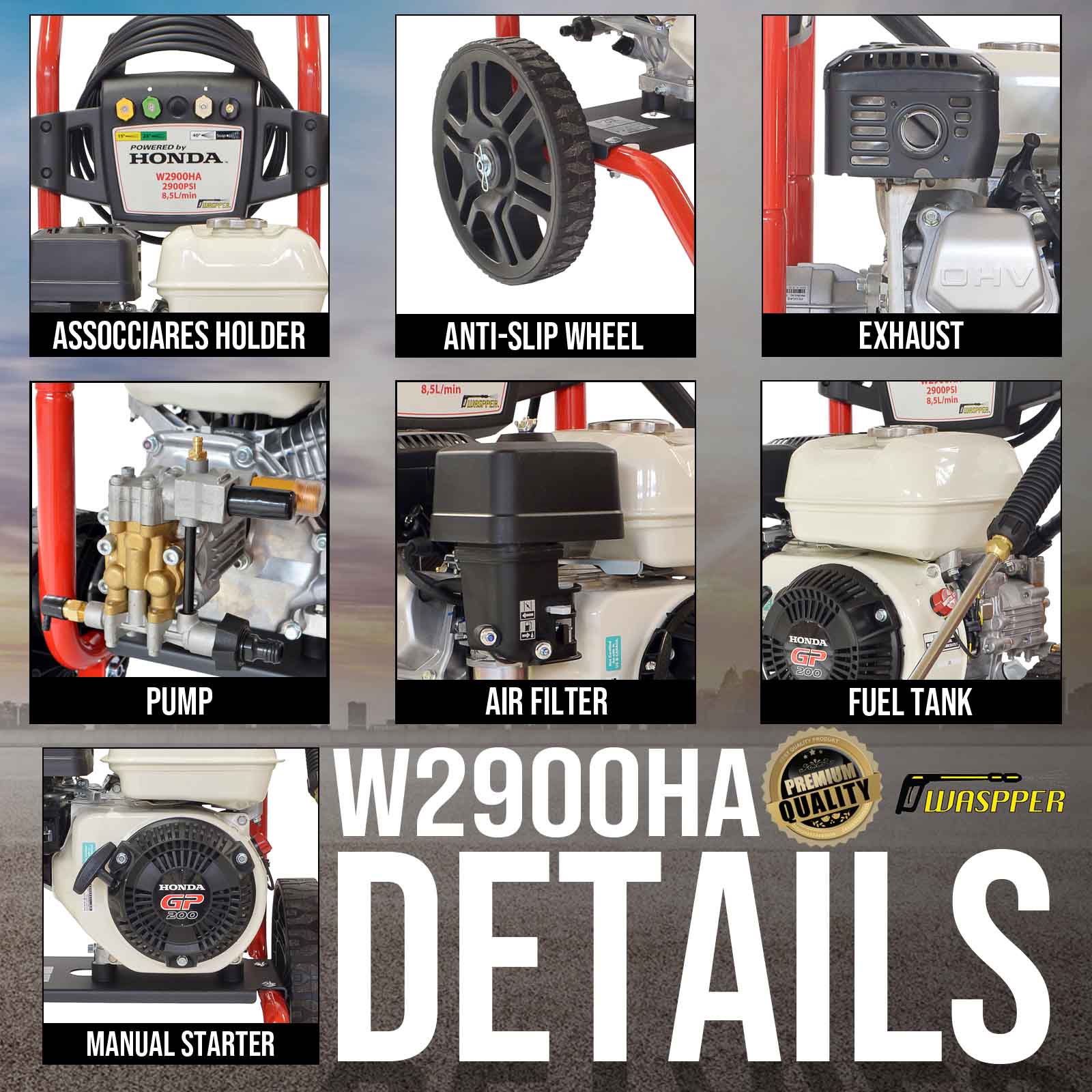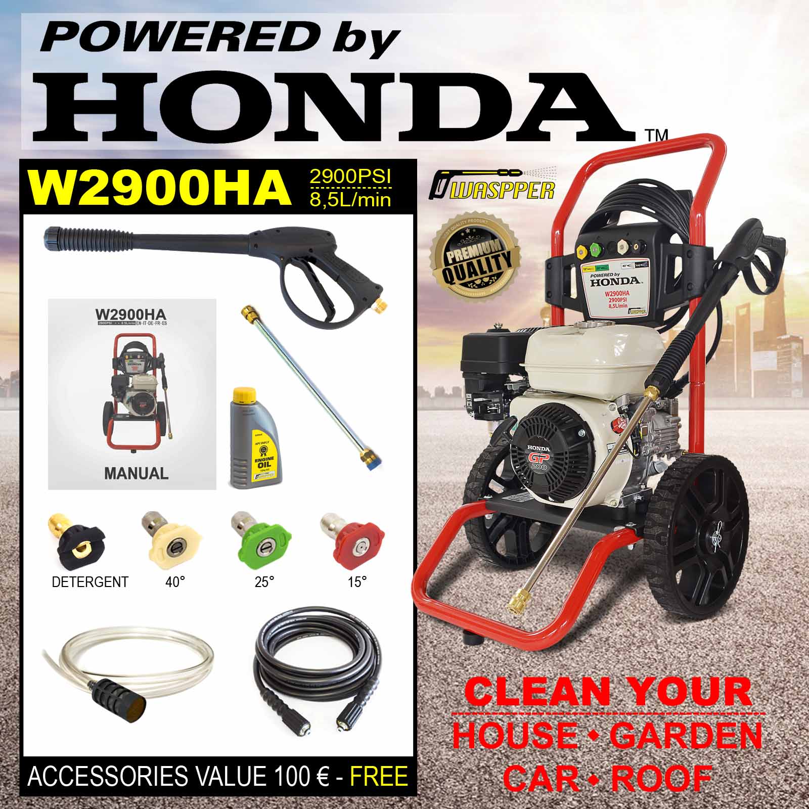 ✦ Petrol Pressure Washer ✦ Powered by HONDA GP 160 – 2900 PSI 163cc Petrol Engine Powered High Pressure Portable Jet Sprayer W2900HA ✦ Premium Power Car & Patio Cleaner