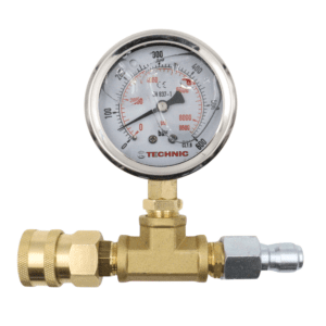 This robust pressure gauge with a brass body and large, easy-to-read dial is designed for measuring high pressures up to 600 bar. Thanks to its quick-connect fittings, it can be attached to high-pressure systems quickly, safely, and without tools. It is suitable for monitoring pressure in professional pressure washers, pumping systems, hydraulic setups, and other industrial applications.